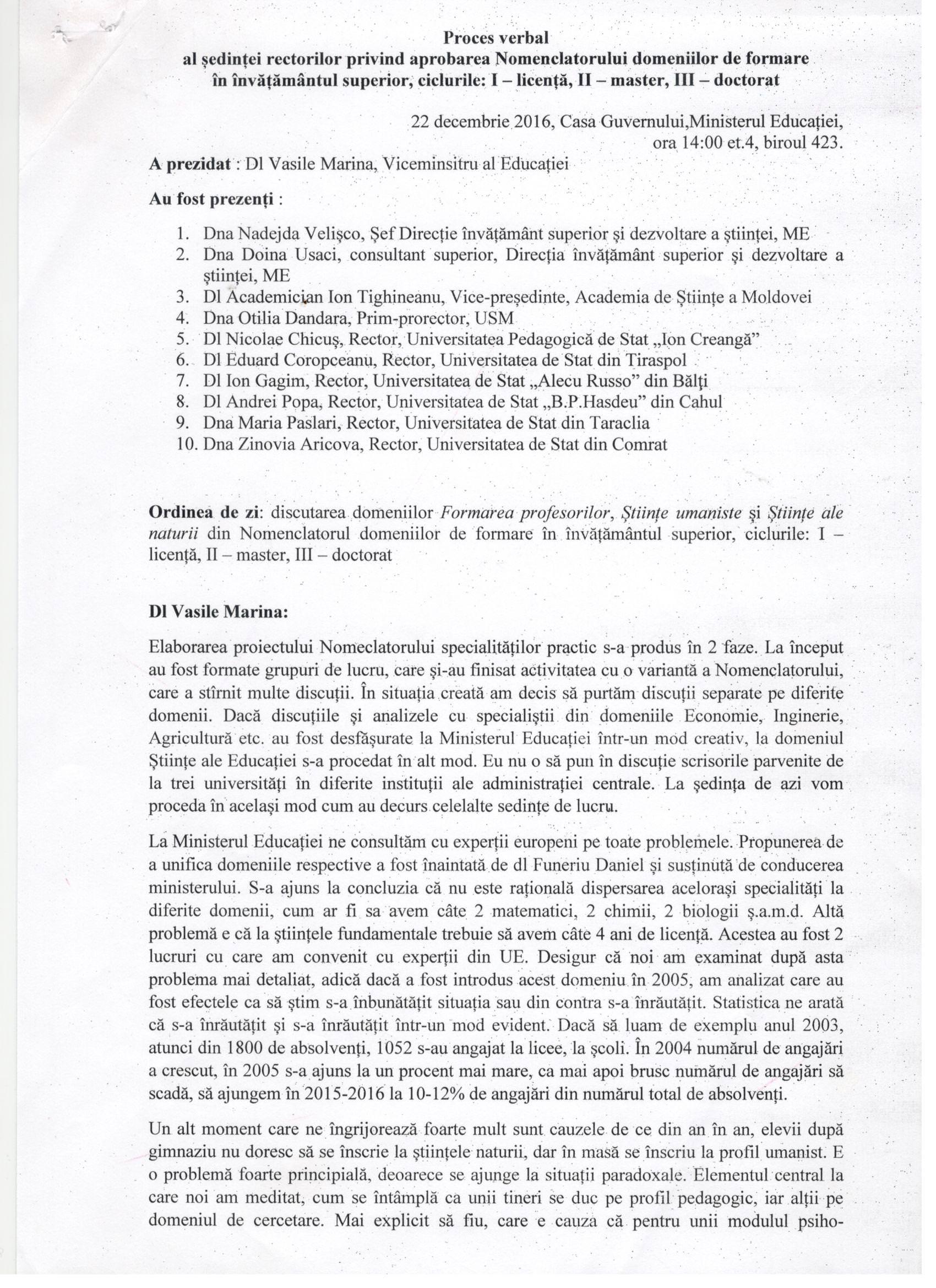 Proiectul Nomenclatorului a fost publicat la rubrica Transparența decizională pe data de 29 iulie 2016, iar ca urmare a dezbaterilor organizate în carul Ministerului Educației și a avizării de la ministerele de resort, a suferit mici modificări pe diverse domenii, inclusiv pe domeniul Științe ale educației. Proiectul final, prezentat Guvernului, este rezultatul mai multor dezbateri și a peste 20 de ședințe, organizate pe domenii, cu toate universitățile. Ultima ședință a avut loc pe data de 22 decembrie 2017, la ea participând rectori ai instituțiilor de învățământ superior.